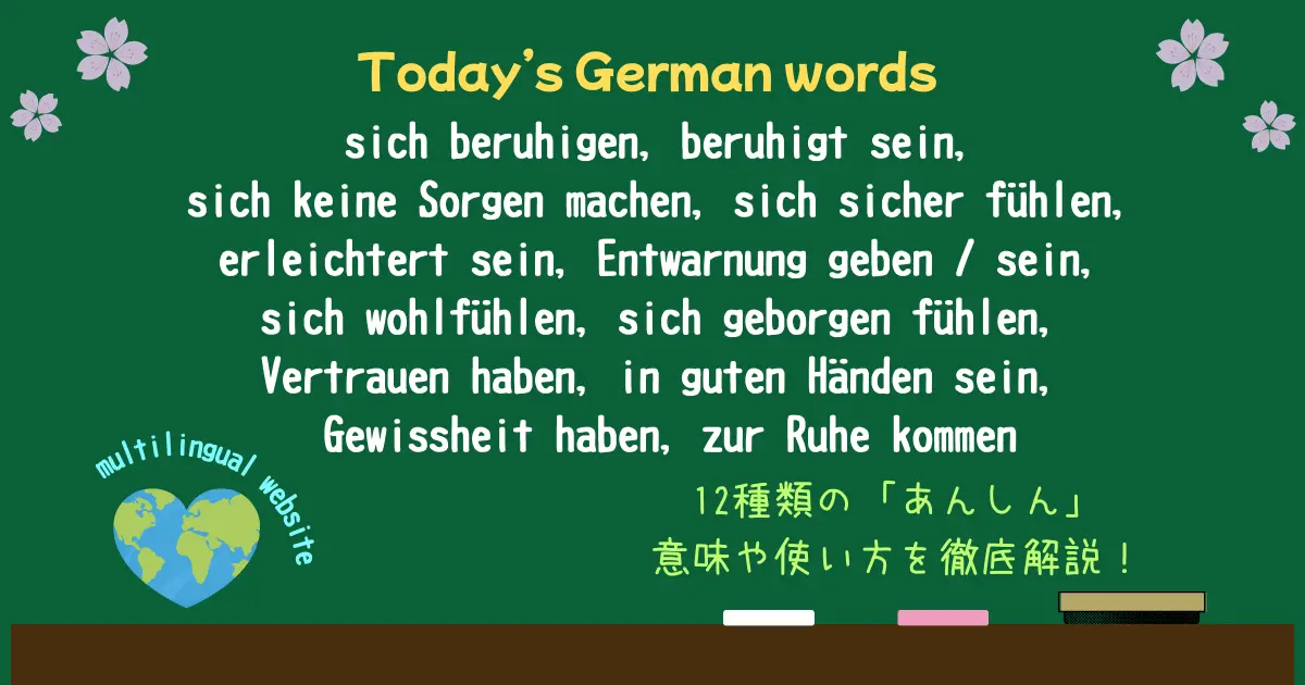 不安が消える・ホッとする・心が静まる… ドイツ語の「安心する」を完全整理!12表現を使い分けテスト付きで徹底解説 (sich beruhigen, beruhigt sein, sich keine Sorgen machen, sich sicher fühlen, erleichtert sein, Entwarnung geben / sein, sich wohlfühlen, sich geborgen fühlen, Vertrauen haben, in guten Händen sein, Gewissheit haben, zur Ruhe kommen)